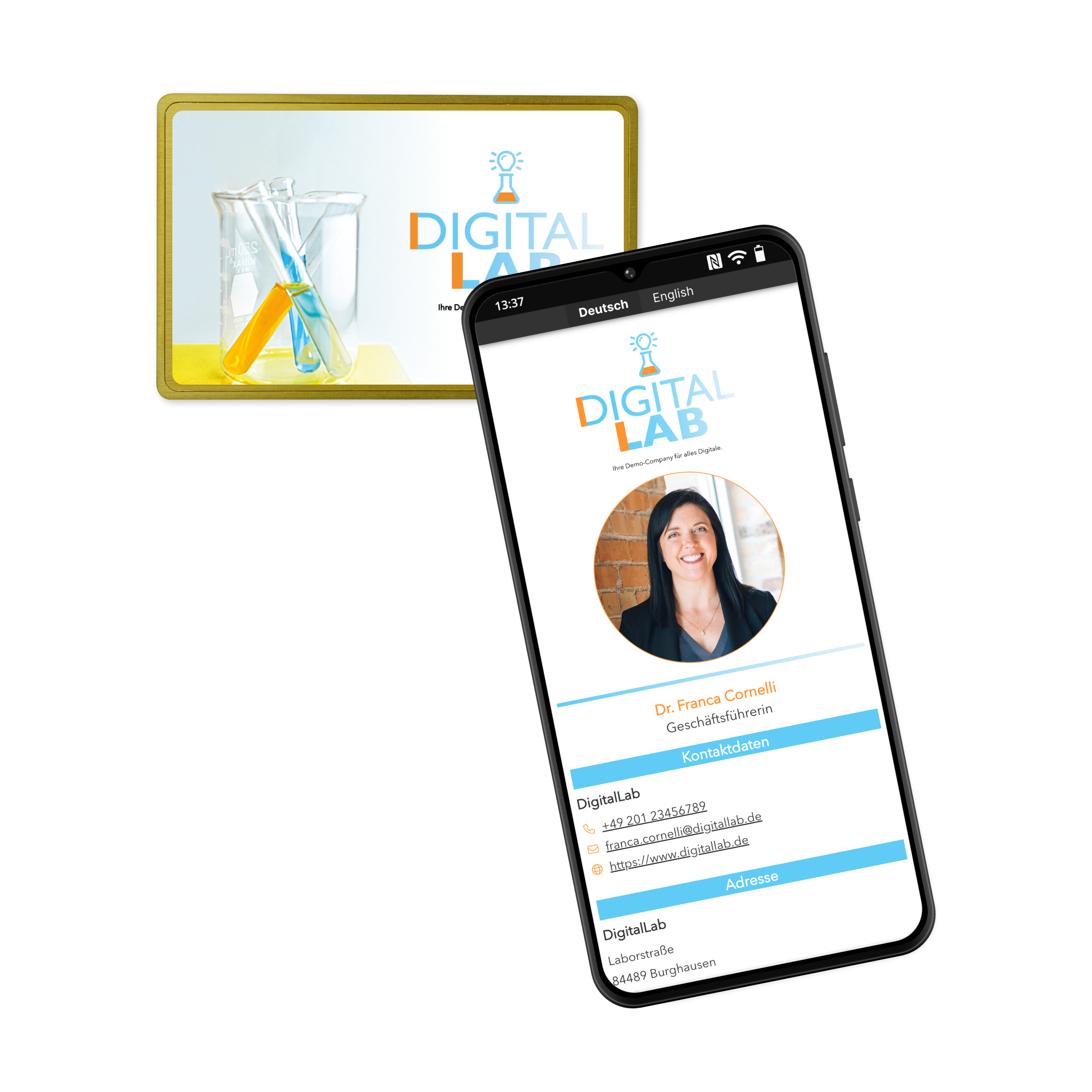 - An NFC-vCard made of metal/PVC