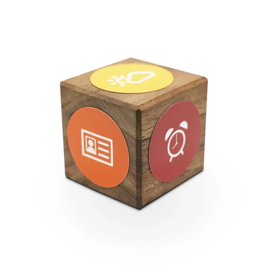 With our NFC Cube you get a six-sided cube and nine separate NFC stickers. Each sticker can be provided by you with any data type and can be stuck on one side of the cube. The symbols on the stickers serve as an idea, in the end it is up to you which data type exactly you write on the NFC sticker.